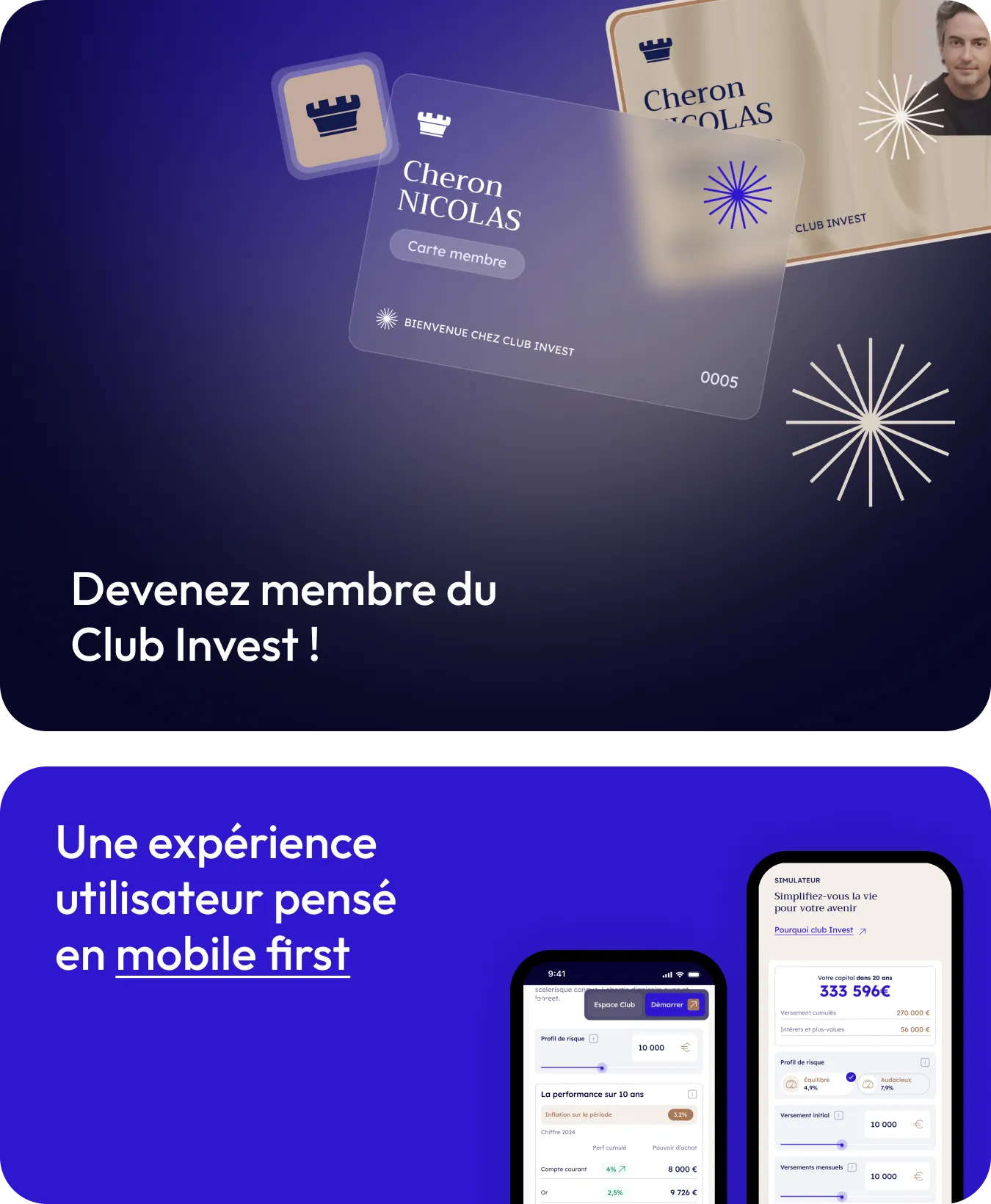 Club Invest propose une solution d’épargne 100 % digitale et 100% orientée actions. Elle permet aux particuliers d’accéder à une expertise habituellement réservée aux investisseurs professionnels aux mêmes conditions de frais et de flexibilité. Nous avons pensé toute l'expérience utilisateur avec 3 enjeux majeurs :