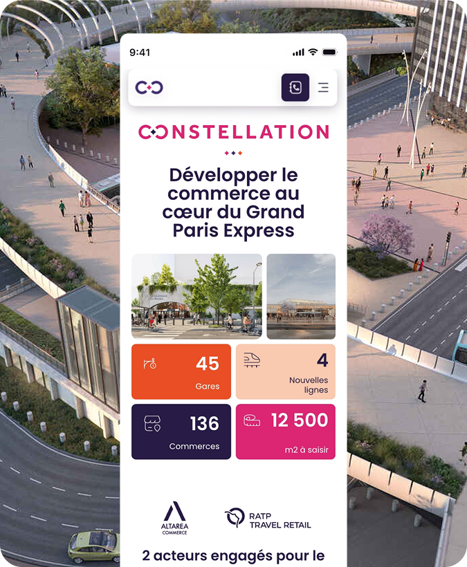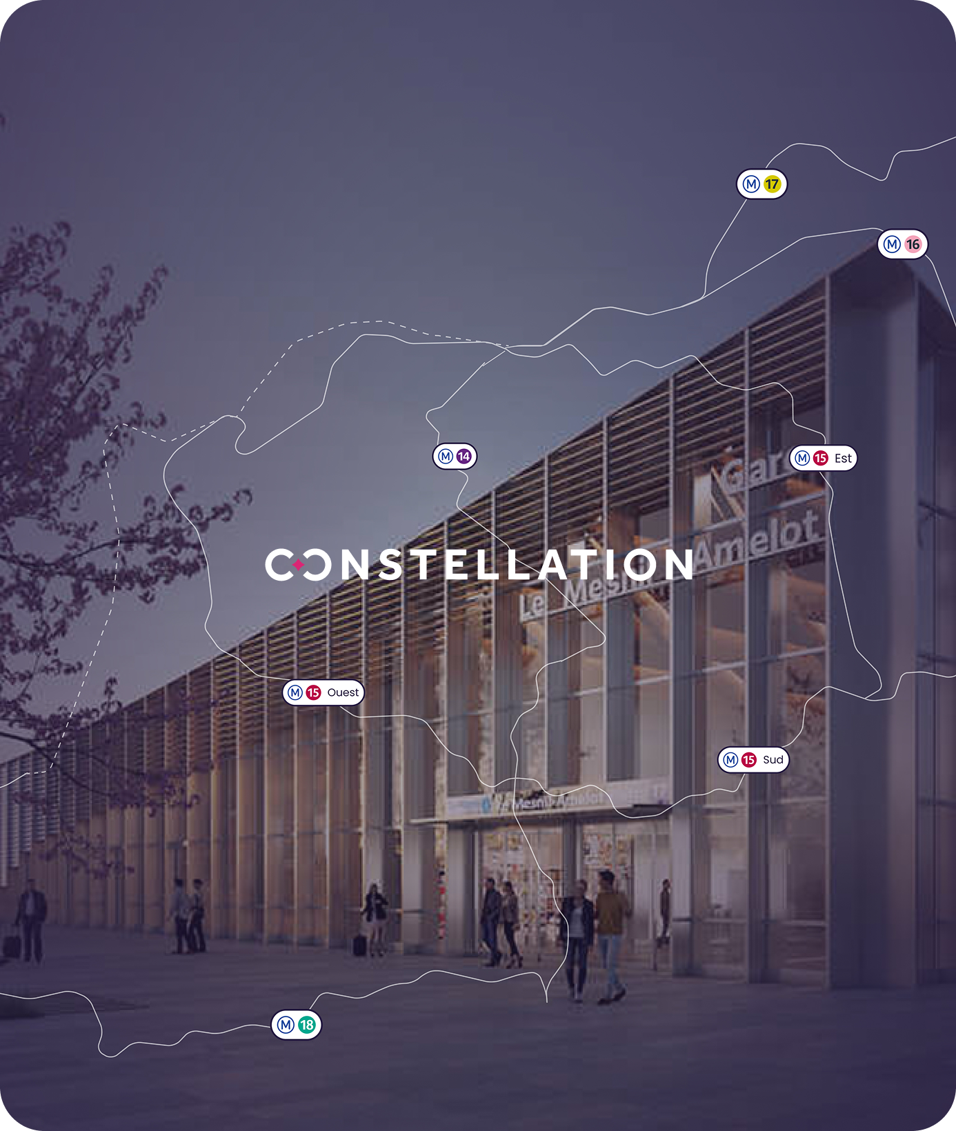 Le Grand Paris Express, c'est le nouveau réseau de transport qui relie les grandes villes d'Île-de-France entre elles : 68 nouvelles gares, 4 lignes de métro automatiques et le prolongement de la ligne 14. Dans ce contexte, Altarea Commerce et RATP Travel Retail ont remporté ensemble l'appel d'offres pour développer et exploiter 136 commerces répartis dans 45 gares. Ils créent Constellation.