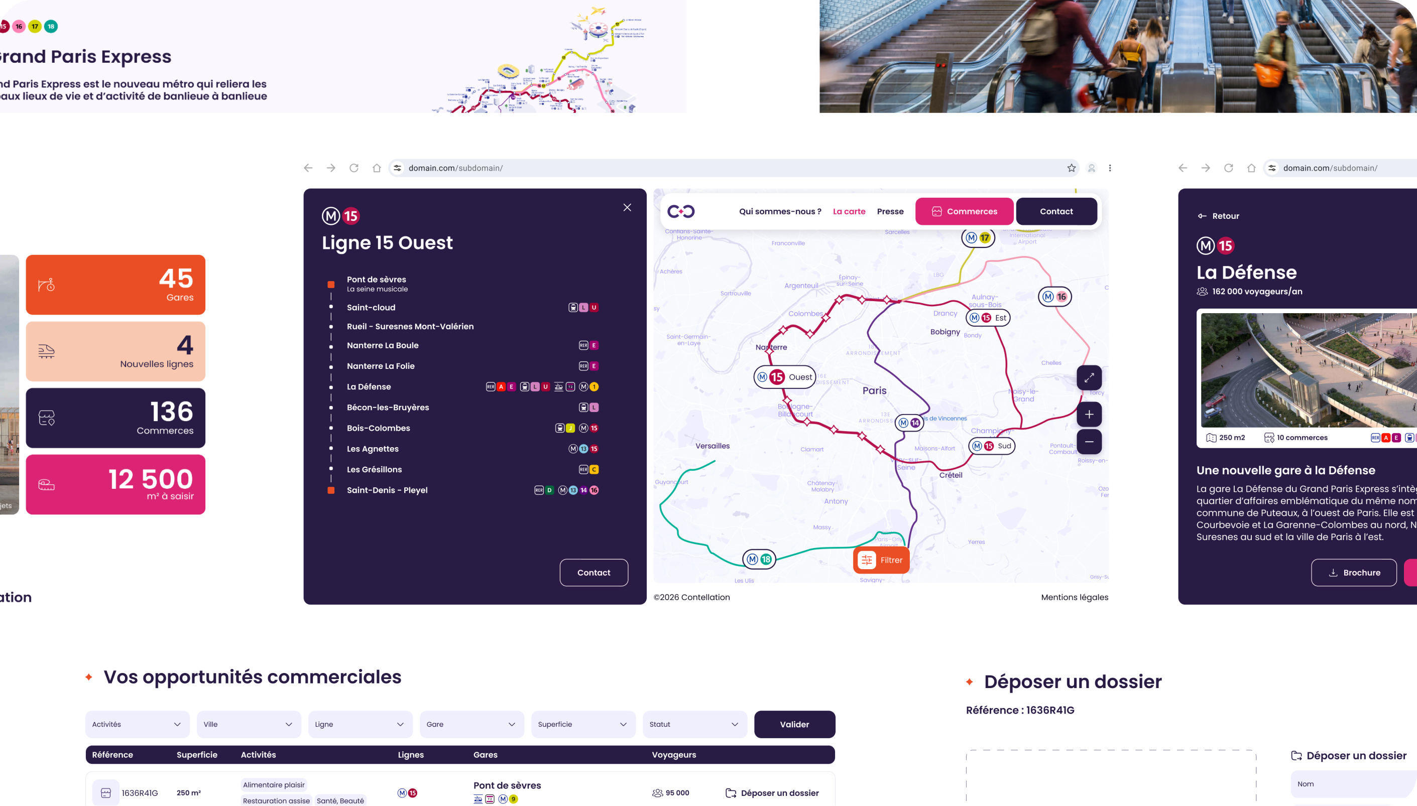 Constellation nous a confié la création du site qui accompagne le lancement de la commercialisation, un outil digital institutionnel et opérationnel, capable de s'adresser aussi bien aux équipes commerciales terrain qu'aux commerçants indépendants à la recherche d'une opportunité d'implantation. Simple, rapide et crédible.