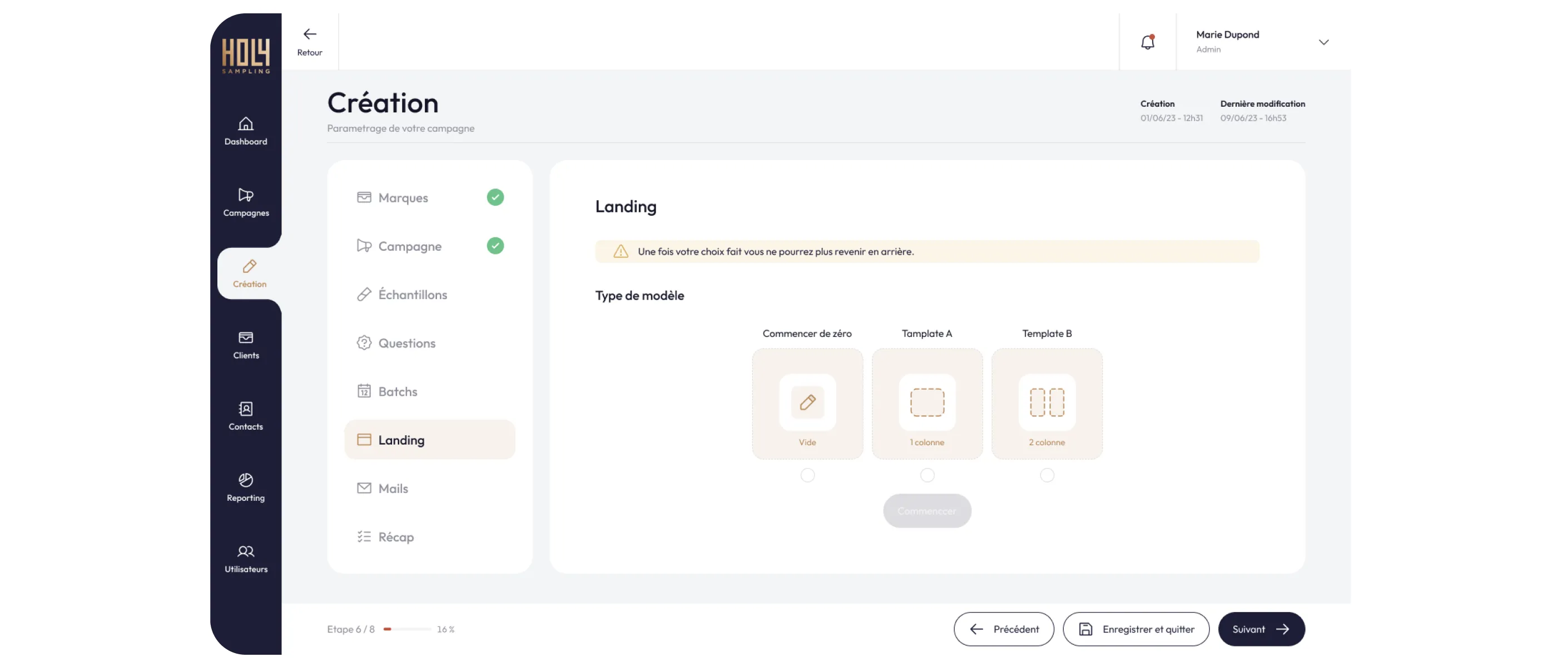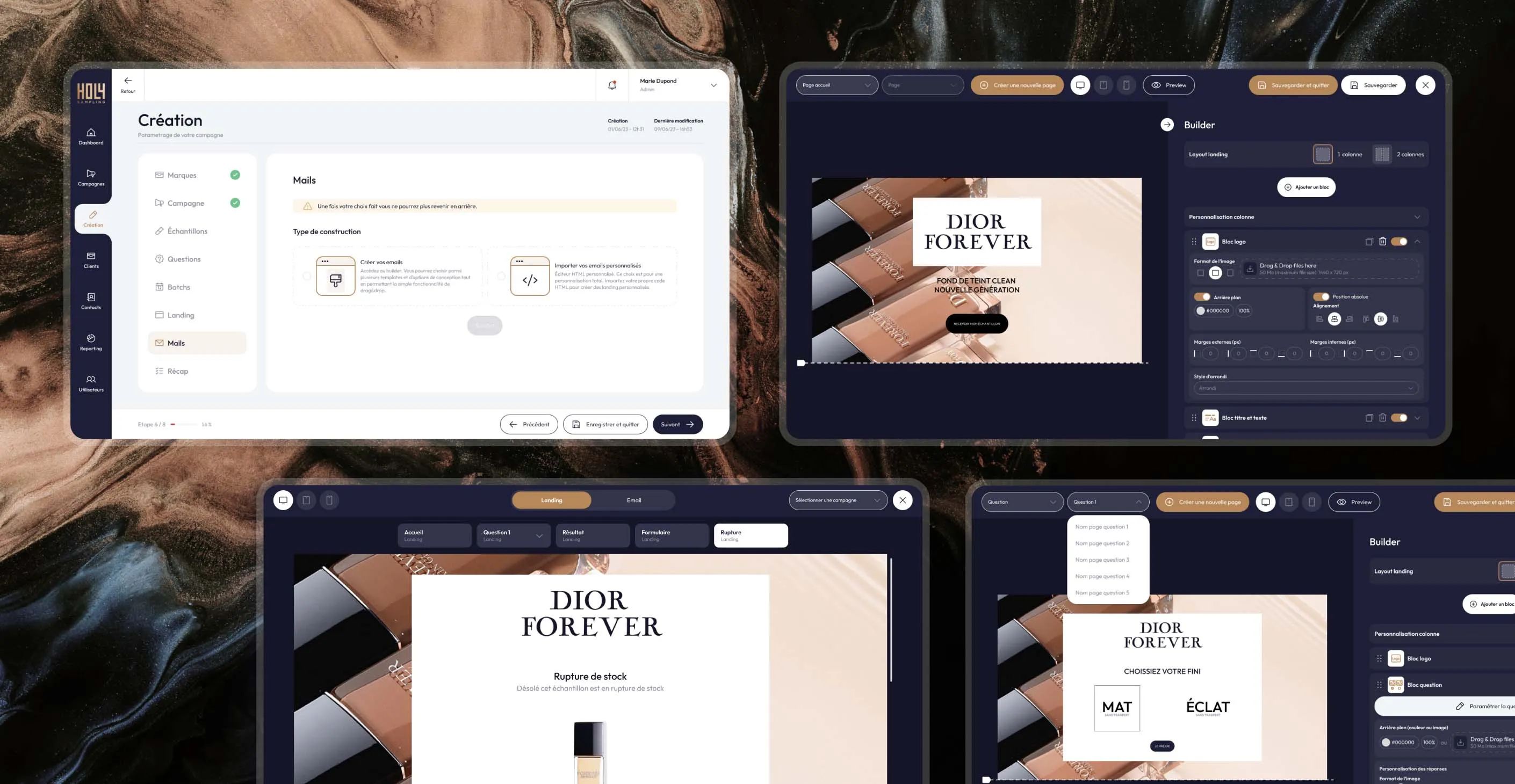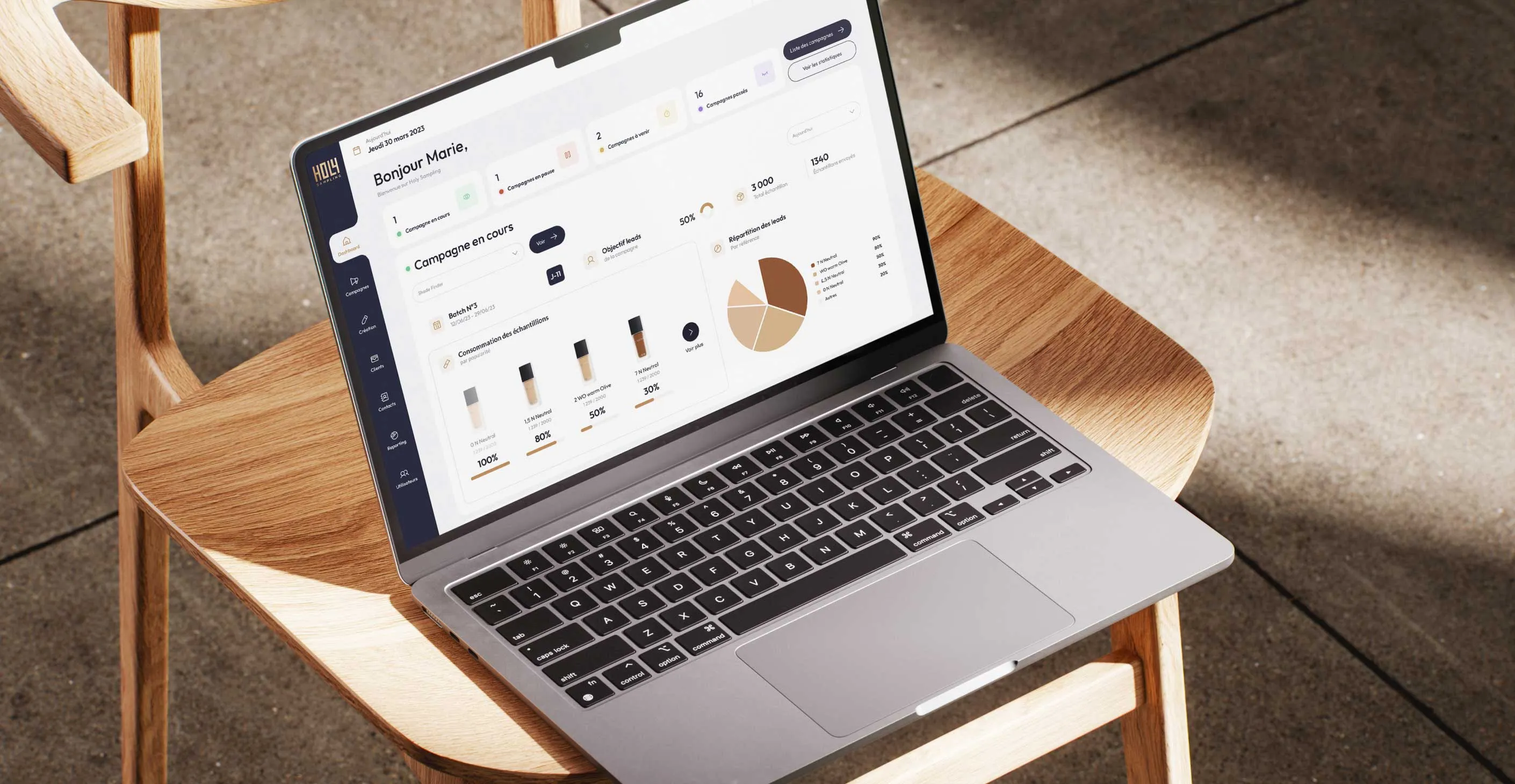 La plateforme Holy Sampling permet de produire les campagnes de bout en bout, de réduire les délais de production et de suivre les résultats via un dashboard clair.